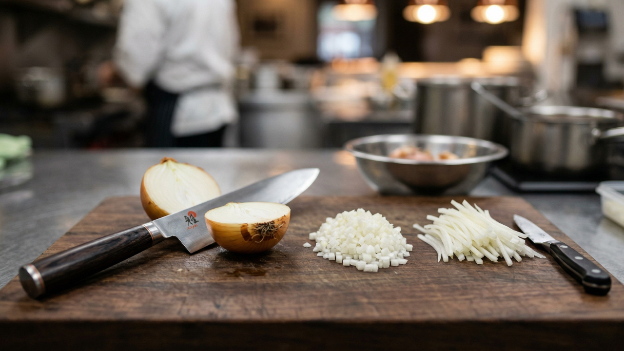Chef Mark demonstrates two foundational onion cuts that appear constantly in serious cooking: julienne and brunoise. What matters here is not simply cutting the onion into different sizes. It is learning how shape, …