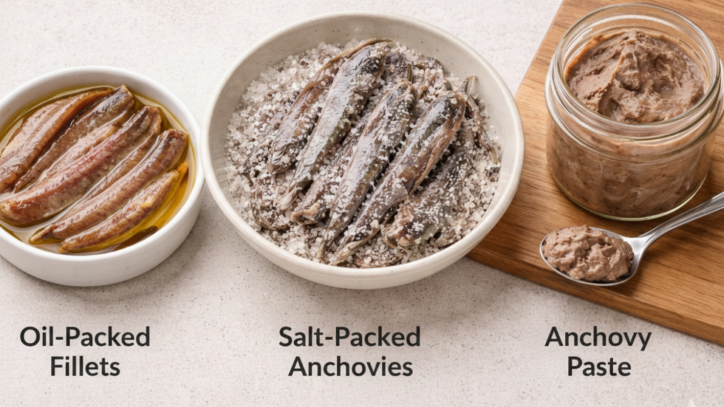 | Salt packed whole anchovies | More concentrated and traditional | Rustic or assertive preparations |