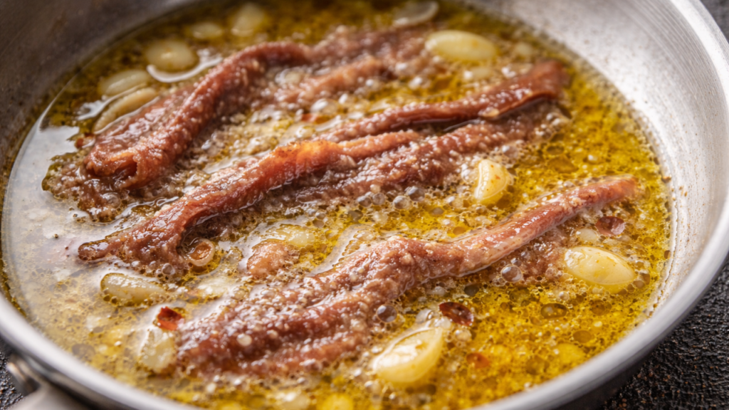 In most cases, the anchovy flavor is not obvious. It supports garlic, tomato, olive, caper, and herb flavors rather than competing with them. The dish tastes balanced and complete.