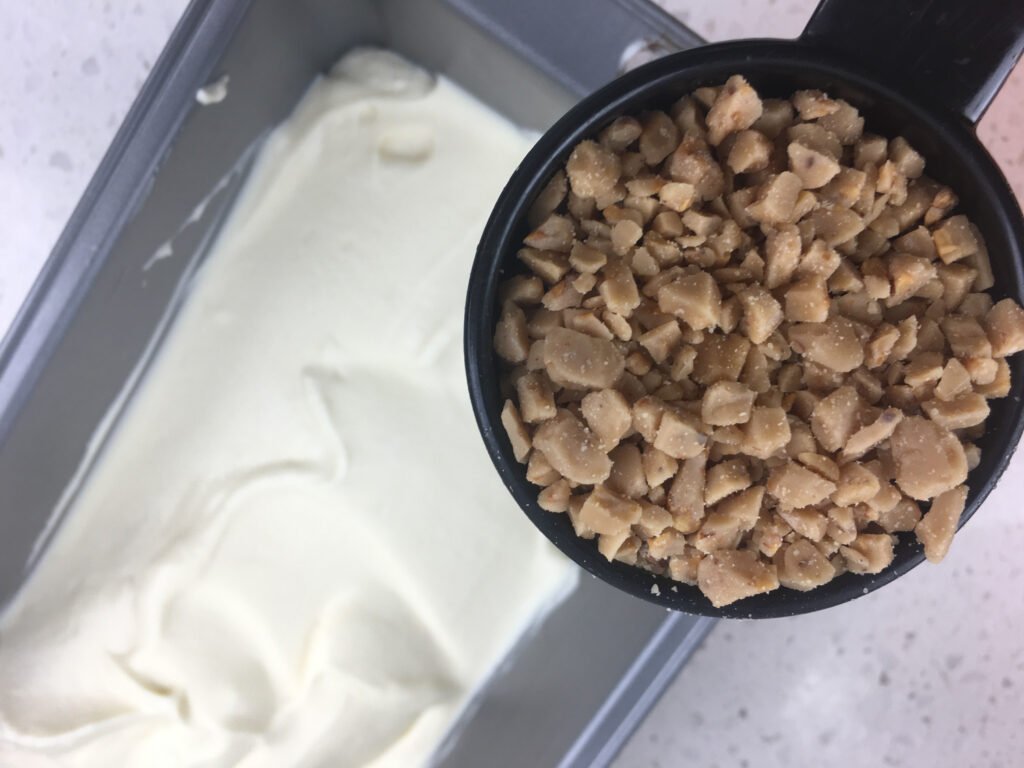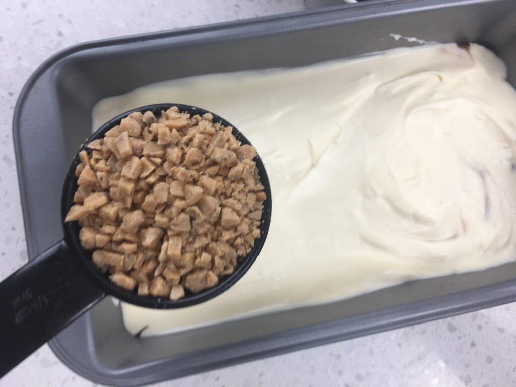 Adds deep cocoa flavor and creates distinct ribbons throughout the ice cream. Chilling is essential to preserve the whipped structure. - Heath English toffee bits