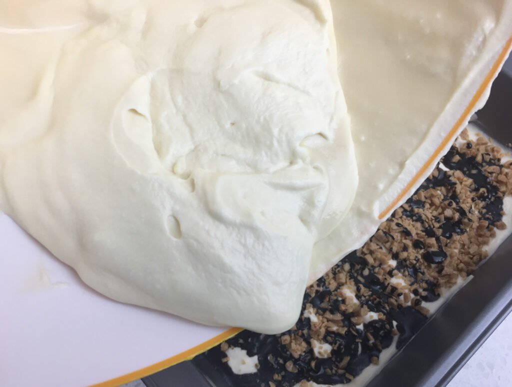 - Spoon the remaining whipped cream mixture on top and spread until smooth.