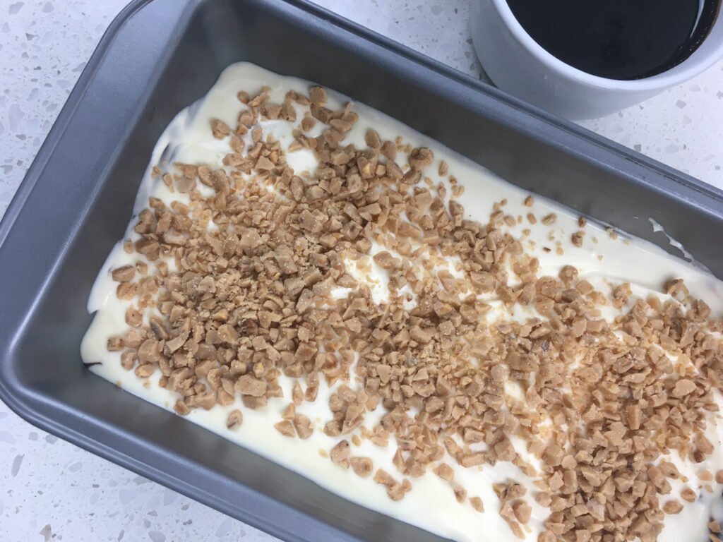 - Insert a butter knife into the mixture at one end of the loaf pan and pull it back and forth across the length of the pan to incorporate the chocolate and toffee throughout.