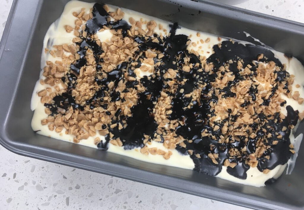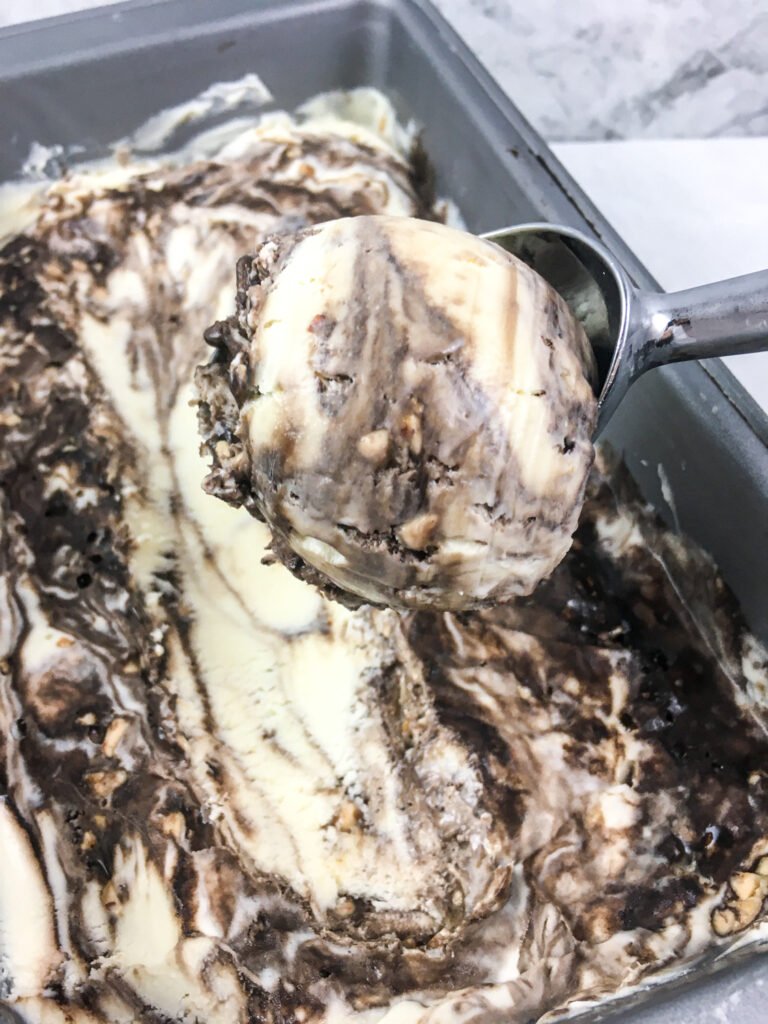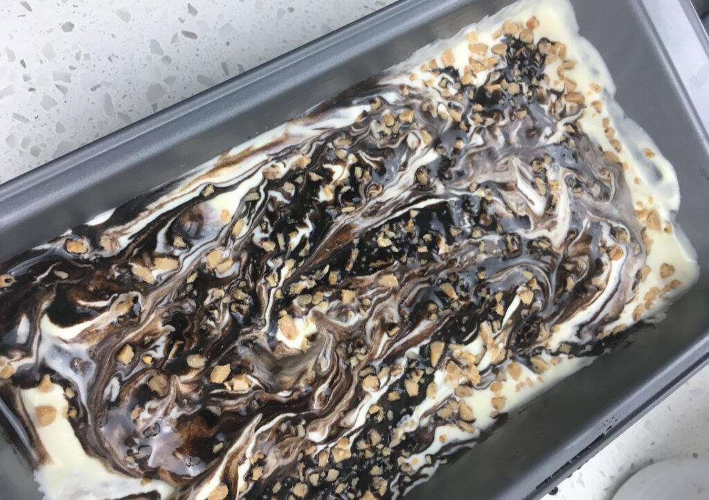 Toasted almonds, pecans, or hazelnuts add contrast and depth. Chop finely so the ice cream remains easy to scoop straight from the freezer. - Swirl in caramel sauce alongside the chocolate