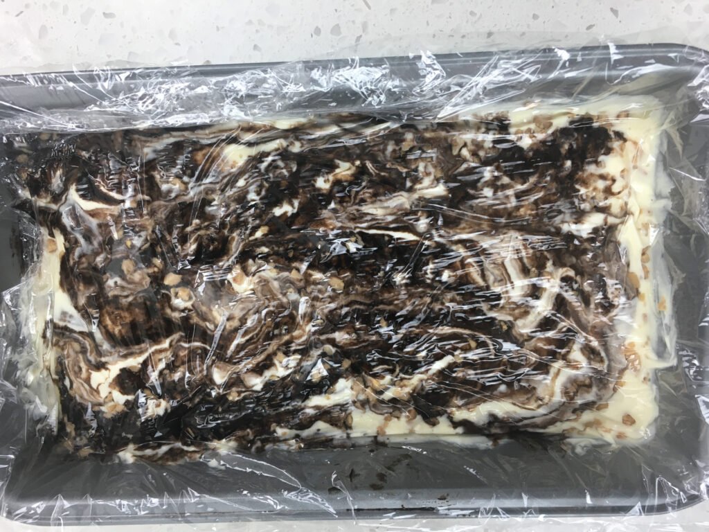 Step 22: Cover the surface with plastic wrap, pressing it gently directly against the ice cream to remove air pockets. Place the pan in the freezer and freeze for at least 4 hours, or preferably overnight, until fully set.