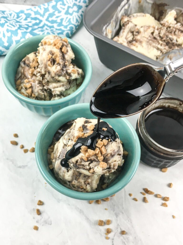 - To serve, scoop into individual bowls and top with additional chocolate sauce and toffee bits, if desired. Enjoy!