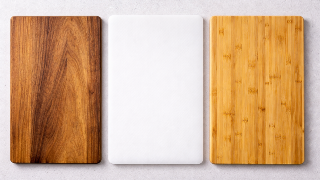 Wood, plastic, and bamboo boards each offer different advantages. Wood boards tend to protect knife edges and support controlled cutting. Plastic boards simplify sanitation when handling raw proteins. Bamboo boards provide durability but may feel firmer under the knife.